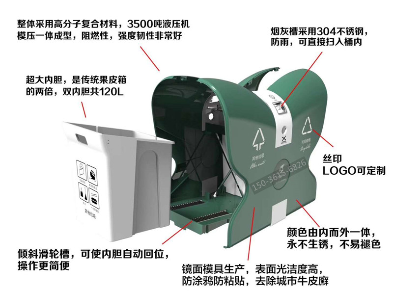 產(chǎn)品特點: 鏡面模具生產(chǎn),表面光潔度高,防涂鴉防粘貼,防砸,耐燒,永不生銹,不易褪色,耐酸堿,易清洗,使用壽命長,具有天然的防盜功能;操作簡單,深受環(huán)衛(wèi)系統(tǒng)客戶青睞。